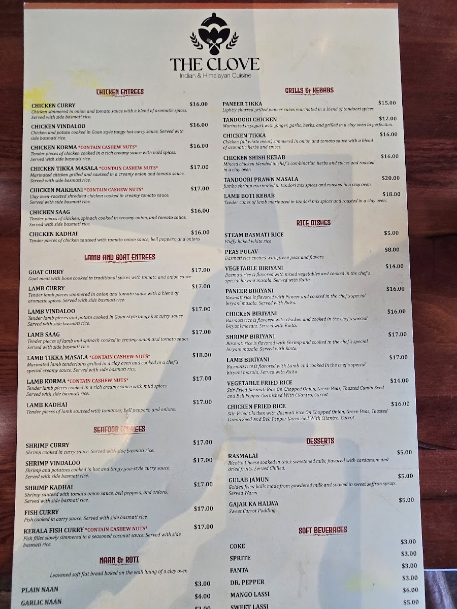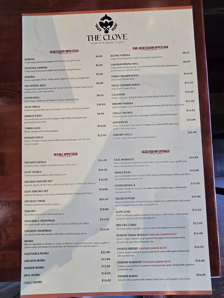 Welcome to The Clove Restaurant, a delightful culinary haven located in Oklahoma City that specializes in authentic Indian and Himalayan cuisine, with a strong emphasis on Nepali flavors. The menu features an array of appetizers like the Samosa Chaat and Pakora, each bursting with flavor and perfect for a starters. Vegetarian entrees such as Mutter Paneer and Paneer Tikka Masala are crafted with creamy, rich sauces that transport you to the heart of India.